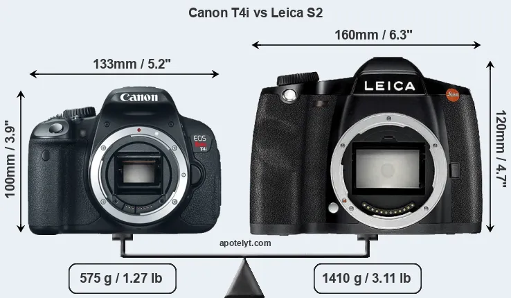 If the front view area (width x height) of the cameras is taken as an aggregate measure of their size, the Leica S2 is considerably larger (44 percent) than the Canon T4i. Moreover, the S2 is substantially heavier (145 percent) than the T4i. It is noteworthy in this context that the S2 is splash and dust-proof, while the T4i does not feature any corresponding weather-sealing.