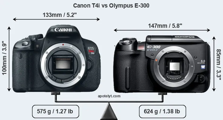 The physical size and weight of the Canon T4i and the Olympus E-300 are illustrated in the side-by-side display below. The two cameras are presented according to their relative size. Three consecutive views from the front, the top, and the rear side are shown. All width, height and depth measures are rounded to the nearest millimeter.
