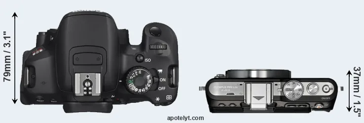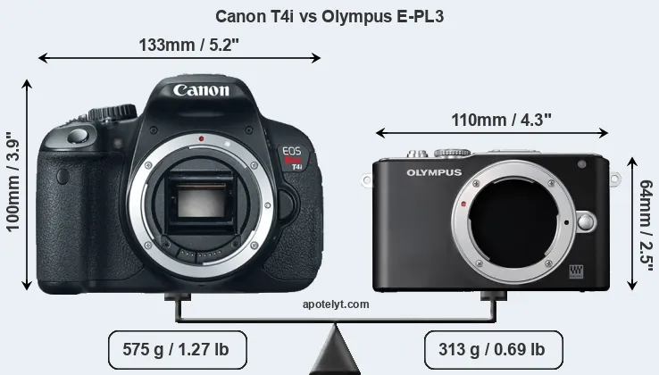 The side-by-side display below illustrates the physical size and weight of the Canon T4i and the Olympus E-PL3. The two cameras are presented according to their relative size. Three successive views from the front, the top, and the rear are shown. All size dimensions are rounded to the nearest millimeter.