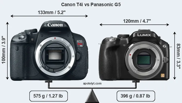 An illustration of the physical size and weight of the Canon T4i and the Panasonic G5 is provided in the side-by-side display below. The two cameras are presented according to their relative size. Three successive views from the front, the top, and the rear are shown. All width, height and depth dimensions are rounded to the nearest millimeter.