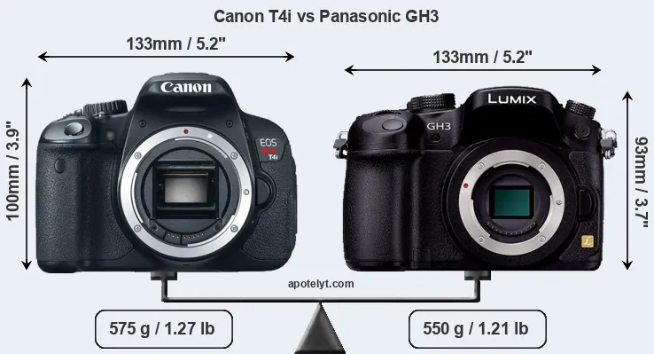 An illustration of the physical size and weight of the Canon T4i and the Panasonic GH3 is provided in the side-by-side display below. The two cameras are presented according to their relative size. Three consecutive perspectives from the front, the top, and the back are available. All width, height and depth measures are rounded to the nearest millimeter.