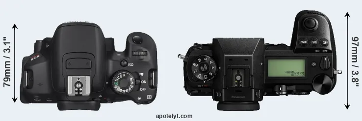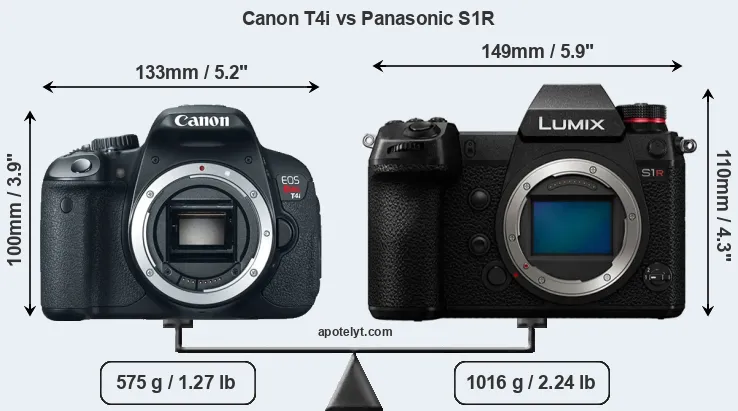 The side-by-side display below illustrates the physical size and weight of the Canon T4i and the Panasonic S1R. The two cameras are presented according to their relative size. Three successive views from the front, the top, and the rear are shown. All width, height and depth measures are rounded to the nearest millimeter.