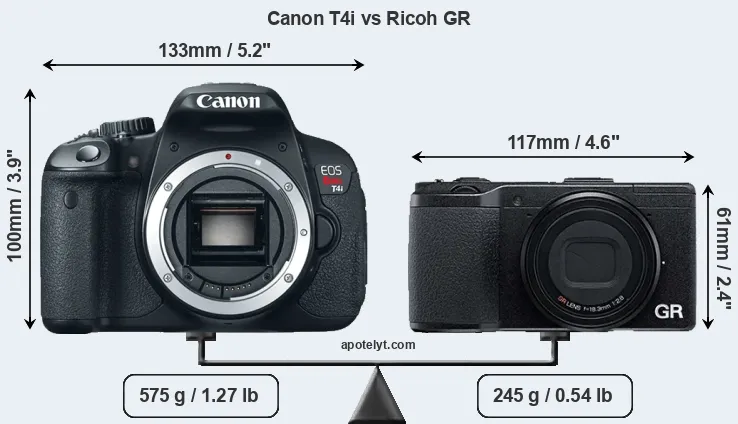 The physical size and weight of the Canon T4i and the Ricoh GR are illustrated in the side-by-side display below. The two cameras are presented according to their relative size. Three consecutive perspectives from the front, the top, and the back are available. All size dimensions are rounded to the nearest millimeter.