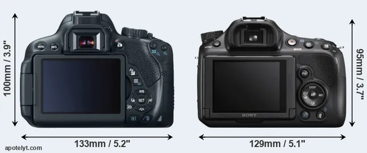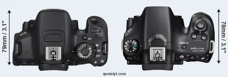 An illustration of the physical size and weight of the Canon T4i and the Sony A58 is provided in the side-by-side display below. The two cameras are presented according to their relative size. Three successive views from the front, the top, and the rear are shown. All width, height and depth dimensions are rounded to the nearest millimeter.