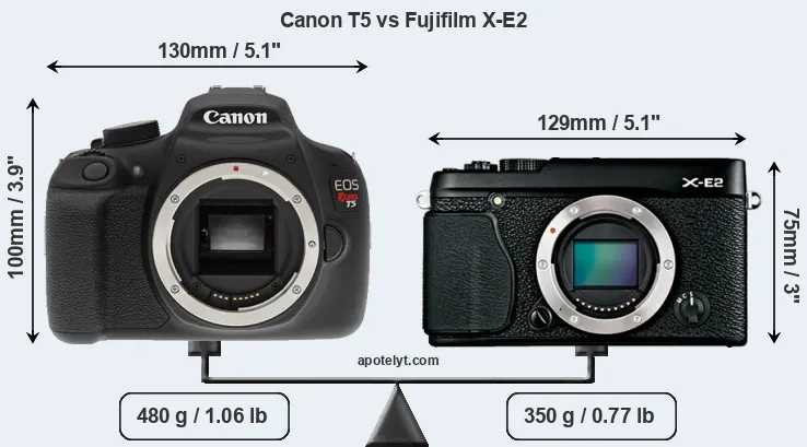 The side-by-side display below illustrates the physical size and weight of the Canon T5 and the Fujifilm X-E2. The two cameras are presented according to their relative size. Three successive views from the front, the top, and the rear are shown. All width, height and depth dimensions are rounded to the nearest millimeter.