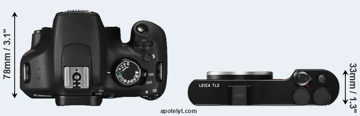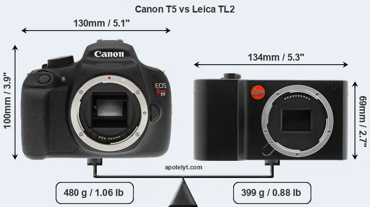 The side-by-side display below illustrates the physical size and weight of the Canon T5 and the Leica TL2. The two cameras are presented according to their relative size. Three consecutive views from the front, the top, and the rear side are shown. All width, height and depth dimensions are rounded to the nearest millimeter.