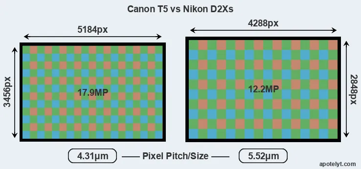 Despite having a smaller sensor, the Canon T5 offers a higher resolution of 17.9 megapixels, compared with 12.2 MP of the Nikon D2Xs. This megapixels advantage comes at the cost of a higher pixel density and a smaller size of the individual pixel (with a pixel pitch of 4.31μm versus 5.52μm for the D2Xs). However, it should be noted that the T5 is much more recent (by 7 years and 8 months) than the D2Xs, and its sensor will have benefitted from technological advances during this time that make it possible to gather light more efficiently.