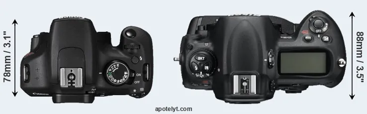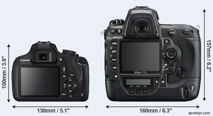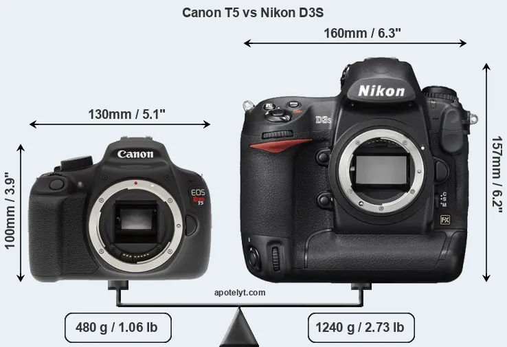 The physical size and weight of the Canon T5 and the Nikon D3S are illustrated in the side-by-side display below. The two cameras are presented according to their relative size. Three consecutive views from the front, the top, and the rear side are shown. All width, height and depth dimensions are rounded to the nearest millimeter.