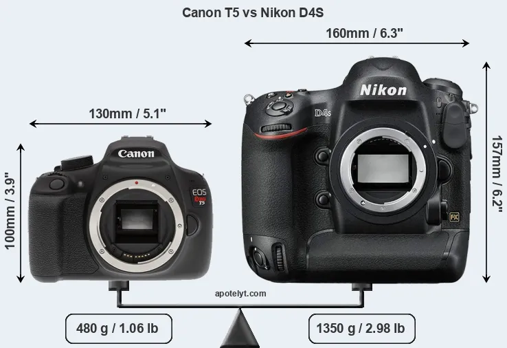 The side-by-side display below illustrates the physical size and weight of the Canon T5 and the Nikon D4S. The two cameras are presented according to their relative size. Three consecutive perspectives from the front, the top, and the back are available. All width, height and depth measures are rounded to the nearest millimeter.