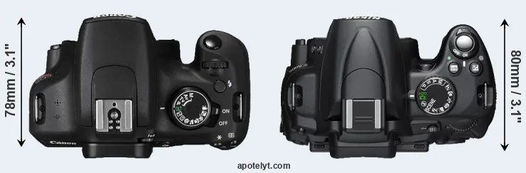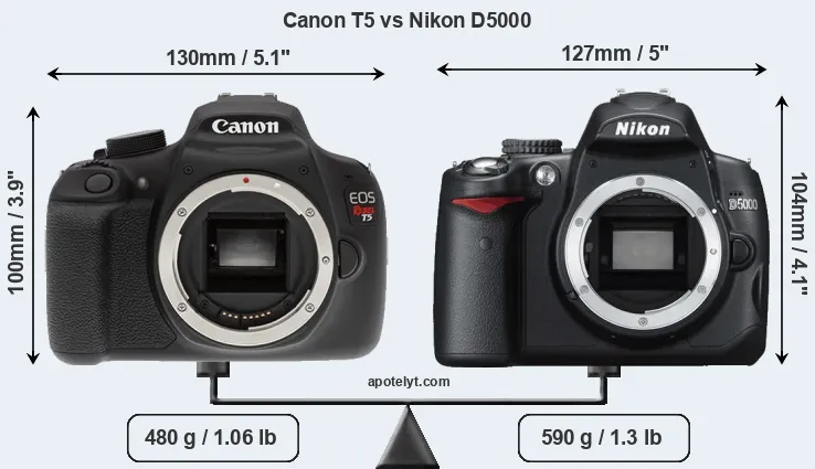 An illustration of the physical size and weight of the Canon T5 and the Nikon D5000 is provided in the side-by-side display below. The two cameras are presented according to their relative size. Three consecutive perspectives from the front, the top, and the back are available. All size dimensions are rounded to the nearest millimeter.
