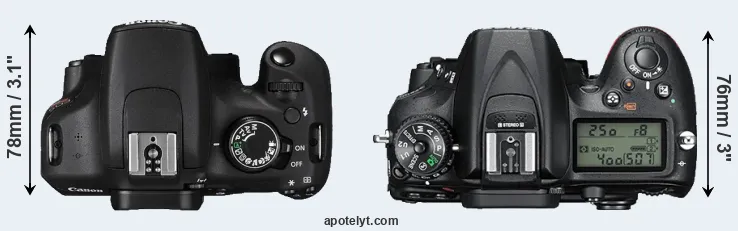 The side-by-side display below illustrates the physical size and weight of the Canon T5 and the Nikon D7200. The two cameras are presented according to their relative size. Three consecutive views from the front, the top, and the rear side are shown. All width, height and depth measures are rounded to the nearest millimeter.