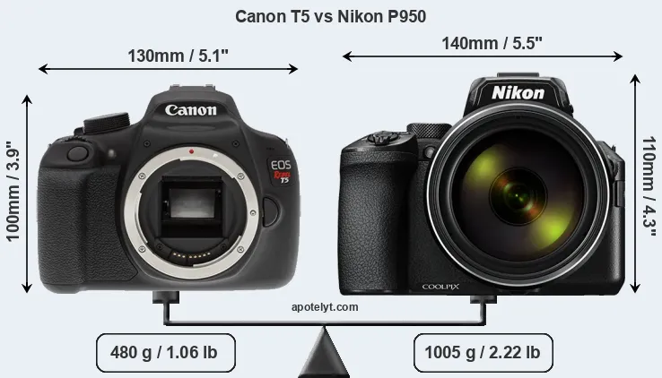 An illustration of the physical size and weight of the Canon T5 and the Nikon P950 is provided in the side-by-side display below. The two cameras are presented according to their relative size. Three consecutive views from the front, the top, and the rear side are shown. All width, height and depth measures are rounded to the nearest millimeter.