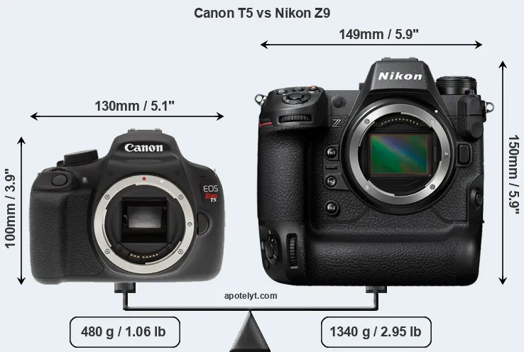 If the front view area (width x height) of the cameras is taken as an aggregate measure of their size, the Nikon Z9 is considerably larger (72 percent) than the Canon T5. Moreover, the Z9 is substantially heavier (179 percent) than the T5. It is noteworthy in this context that the Z9 is splash and dust-proof, while the T5 does not feature any corresponding weather-sealing.