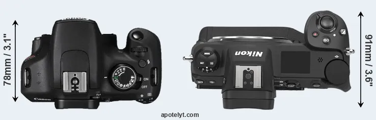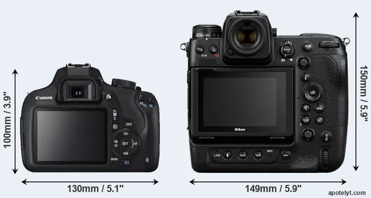 The physical size and weight of the Canon T5 and the Nikon Z9 are illustrated in the side-by-side display below. The two cameras are presented according to their relative size. Three successive views from the front, the top, and the rear are shown. All size dimensions are rounded to the nearest millimeter.