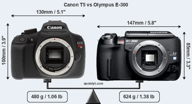 The physical size and weight of the Canon T5 and the Olympus E-300 are illustrated in the side-by-side display below. The two cameras are presented according to their relative size. Three consecutive perspectives from the front, the top, and the back are available. All size dimensions are rounded to the nearest millimeter.