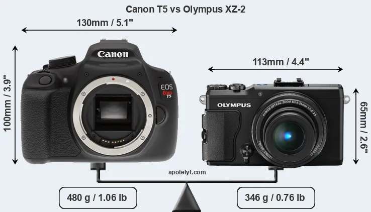 The physical size and weight of the Canon T5 and the Olympus XZ-2 are illustrated in the side-by-side display below. The two cameras are presented according to their relative size. Three consecutive perspectives from the front, the top, and the back are available. All width, height and depth dimensions are rounded to the nearest millimeter.