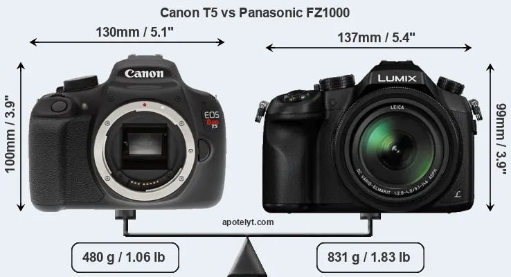 The side-by-side display below illustrates the physical size and weight of the Canon T5 and the Panasonic FZ1000. The two cameras are presented according to their relative size. Three consecutive perspectives from the front, the top, and the back are available. All width, height and depth measures are rounded to the nearest millimeter.