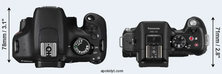 The side-by-side display below illustrates the physical size and weight of the Canon T5 and the Panasonic G5. The two cameras are presented according to their relative size. Three consecutive perspectives from the front, the top, and the back are available. All size dimensions are rounded to the nearest millimeter.