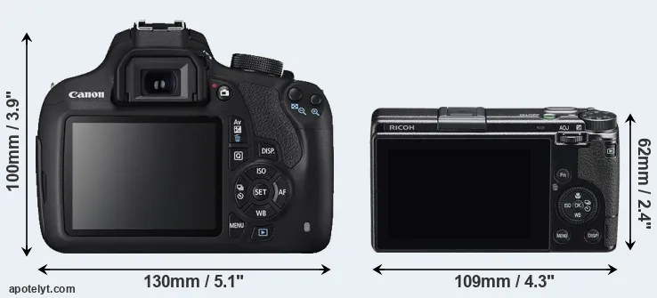 The side-by-side display below illustrates the physical size and weight of the Canon T5 and the Ricoh GR IIIx. The two cameras are presented according to their relative size. Three consecutive views from the front, the top, and the rear side are shown. All width, height and depth dimensions are rounded to the nearest millimeter.