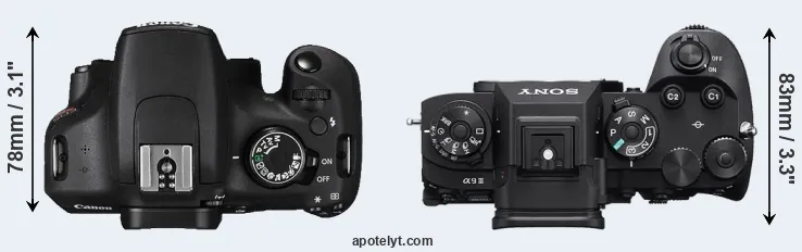 The physical size and weight of the Canon T5 and the Sony A9 III are illustrated in the side-by-side display below. The two cameras are presented according to their relative size. Three consecutive perspectives from the front, the top, and the back are available. All width, height and depth dimensions are rounded to the nearest millimeter.