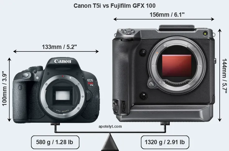 If the front view area (width x height) of the cameras is taken as an aggregate measure of their size, the Fujifilm GFX 100 is considerably larger (69 percent) than the Canon T5i. Moreover, the GFX 100 is substantially heavier (128 percent) than the T5i. It is noteworthy in this context that the GFX 100 is splash and dust-proof, while the T5i does not feature any corresponding weather-sealing.