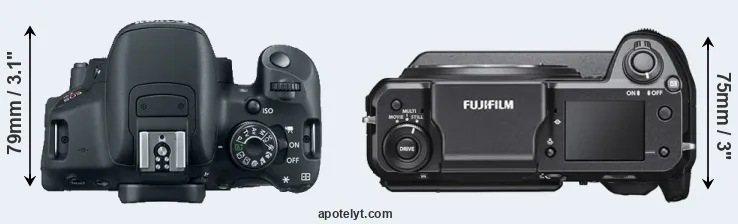 The side-by-side display below illustrates the physical size and weight of the Canon T5i and the Fujifilm GFX 100. The two cameras are presented according to their relative size. Three consecutive views from the front, the top, and the rear side are shown. All width, height and depth measures are rounded to the nearest millimeter.
