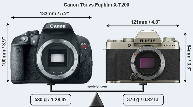 The physical size and weight of the Canon T5i and the Fujifilm X-T200 are illustrated in the side-by-side display below. The two cameras are presented according to their relative size. Three successive views from the front, the top, and the rear are shown. All width, height and depth measures are rounded to the nearest millimeter.