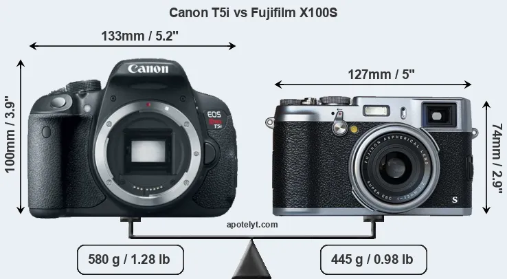 The above size and weight comparisons are to some extent incomplete and possibly misleading, as the X100S has a lens built in, whereas the T5i is an interchangeable lens camera that requires a separate lens. Attaching the latter will add extra weight and bulk to the setup. You can compare the optics available for the T5i and their specifications in the Canon EF Lens Catalog.