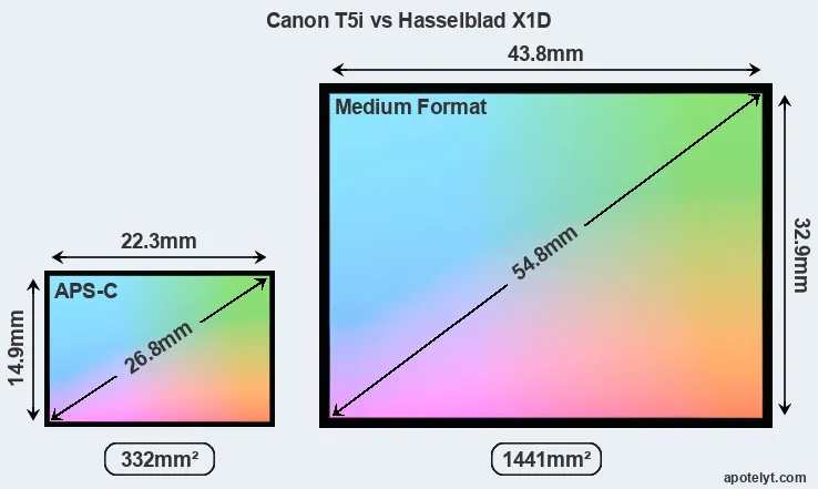 Of the two cameras under consideration, the Canon T5i features an APS-C sensor and the Hasselblad X1D a medium format sensor. The sensor area in the X1D is 334 percent bigger. As a result of these sensor size differences, the cameras have a format factor of, respectively, 1.6 and 0.79. The sensor in the T5i has a native 3:2 aspect ratio, while the one in the X1D offers a 4:3 aspect.