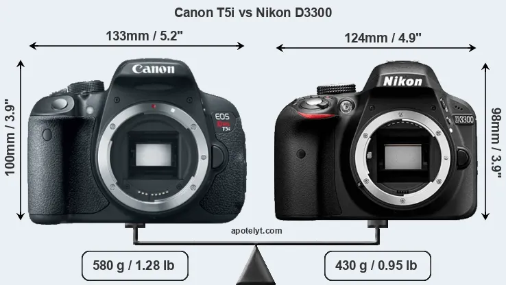 An illustration of the physical size and weight of the Canon T5i and the Nikon D3300 is provided in the side-by-side display below. The two cameras are presented according to their relative size. Three consecutive views from the front, the top, and the rear side are shown. All size dimensions are rounded to the nearest millimeter.