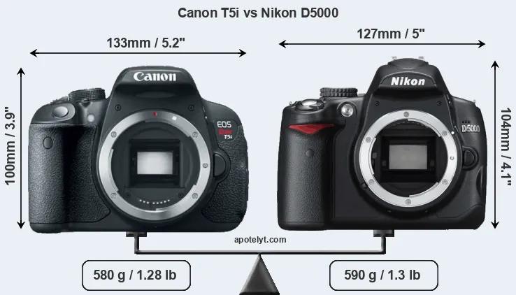 The side-by-side display below illustrates the physical size and weight of the Canon T5i and the Nikon D5000. The two cameras are presented according to their relative size. Three successive views from the front, the top, and the rear are shown. All width, height and depth measures are rounded to the nearest millimeter.