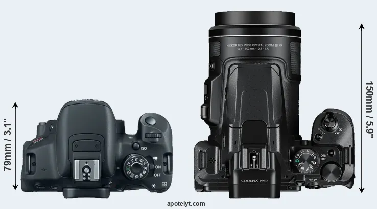 An illustration of the physical size and weight of the Canon T5i and the Nikon P950 is provided in the side-by-side display below. The two cameras are presented according to their relative size. Three successive views from the front, the top, and the rear are shown. All width, height and depth dimensions are rounded to the nearest millimeter.