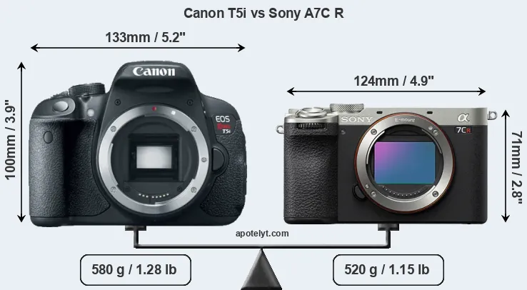 If the front view area (width x height) of the cameras is taken as an aggregate measure of their size, the Sony A7C R is considerably smaller (34 percent) than the Canon T5i. Moreover, the A7C R is markedly lighter (10 percent) than the T5i. It is noteworthy in this context that the A7C R is splash and dust-proof, while the T5i does not feature any corresponding weather-sealing.