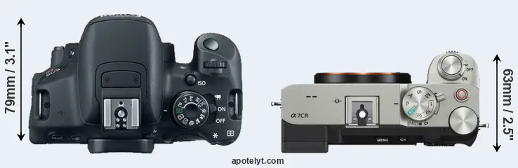 The physical size and weight of the Canon T5i and the Sony A7C R are illustrated in the side-by-side display below. The two cameras are presented according to their relative size. Three consecutive views from the front, the top, and the rear side are shown. All size dimensions are rounded to the nearest millimeter.