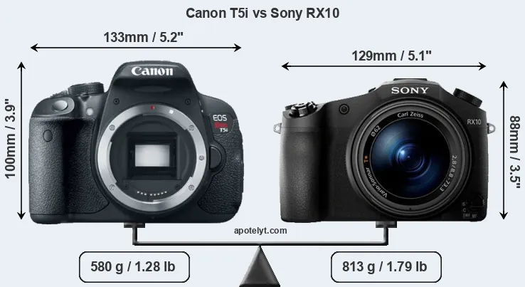 The side-by-side display below illustrates the physical size and weight of the Canon T5i and the Sony RX10. The two cameras are presented according to their relative size. Three successive views from the front, the top, and the rear are shown. All size dimensions are rounded to the nearest millimeter.
