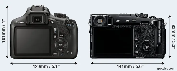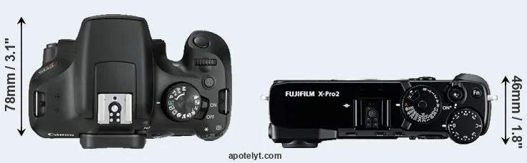 The side-by-side display below illustrates the physical size and weight of the Canon T6 and the Fujifilm X-Pro2. The two cameras are presented according to their relative size. Three successive views from the front, the top, and the rear are shown. All size dimensions are rounded to the nearest millimeter.