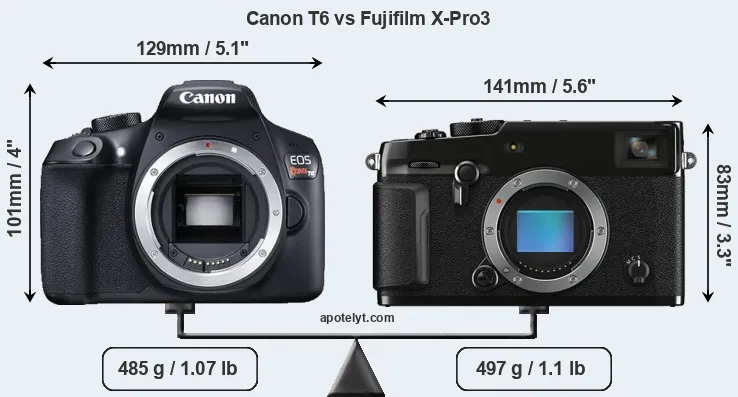 An illustration of the physical size and weight of the Canon T6 and the Fujifilm X-Pro3 is provided in the side-by-side display below. The two cameras are presented according to their relative size. Three successive views from the front, the top, and the rear are shown. All width, height and depth measures are rounded to the nearest millimeter.