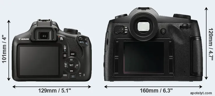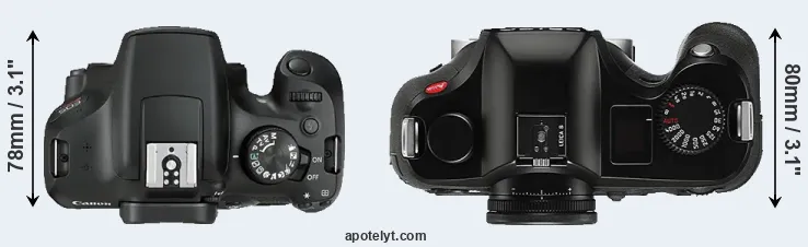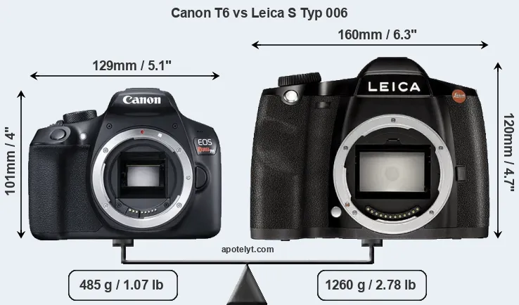 The side-by-side display below illustrates the physical size and weight of the Canon T6 and the Leica S Typ 006. The two cameras are presented according to their relative size. Three consecutive perspectives from the front, the top, and the back are available. All width, height and depth measures are rounded to the nearest millimeter.