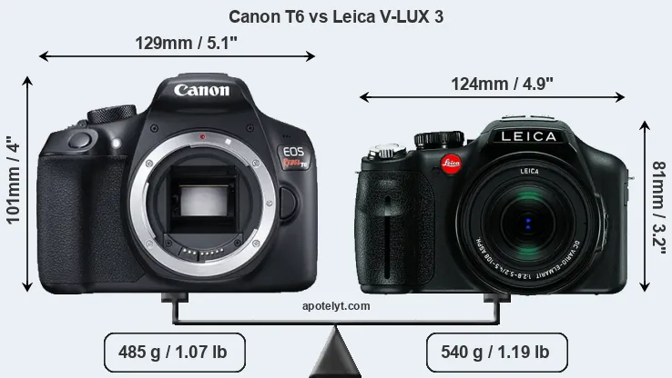 The physical size and weight of the Canon T6 and the Leica V-LUX 3 are illustrated in the side-by-side display below. The two cameras are presented according to their relative size. Three consecutive views from the front, the top, and the rear side are shown. All width, height and depth dimensions are rounded to the nearest millimeter.