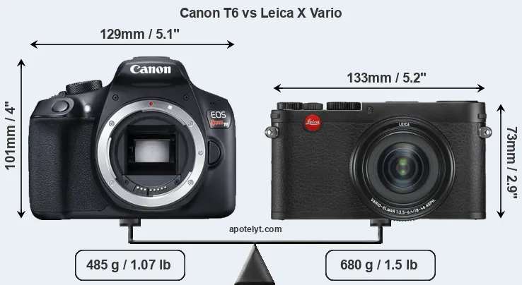 An illustration of the physical size and weight of the Canon T6 and the Leica X Vario is provided in the side-by-side display below. The two cameras are presented according to their relative size. Three consecutive views from the front, the top, and the rear side are shown. All width, height and depth measures are rounded to the nearest millimeter.