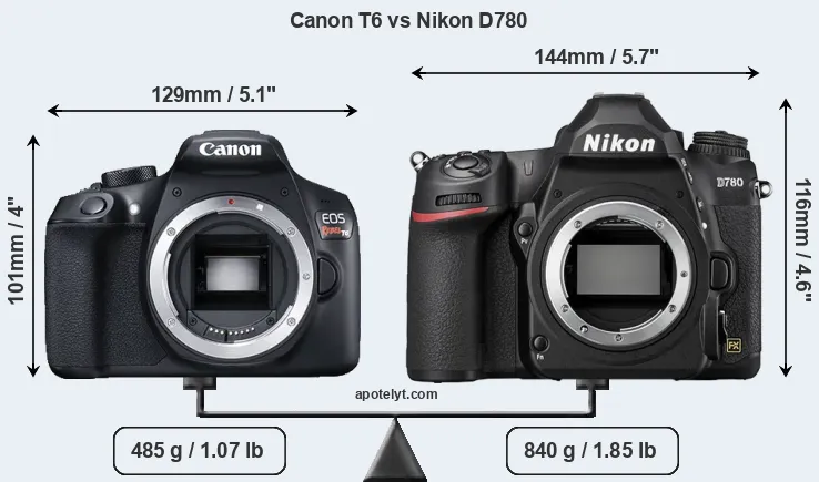 An illustration of the physical size and weight of the Canon T6 and the Nikon D780 is provided in the side-by-side display below. The two cameras are presented according to their relative size. Three consecutive perspectives from the front, the top, and the back are available. All size dimensions are rounded to the nearest millimeter.