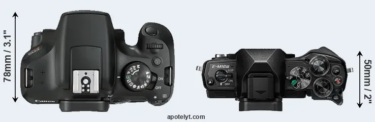 The physical size and weight of the Canon T6 and the Olympus E-M10 III are illustrated in the side-by-side display below. The two cameras are presented according to their relative size. Three successive views from the front, the top, and the rear are shown. All width, height and depth measures are rounded to the nearest millimeter.