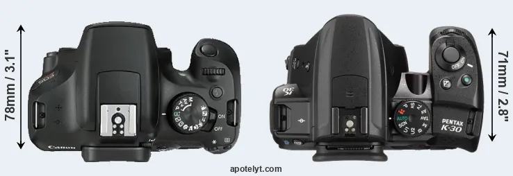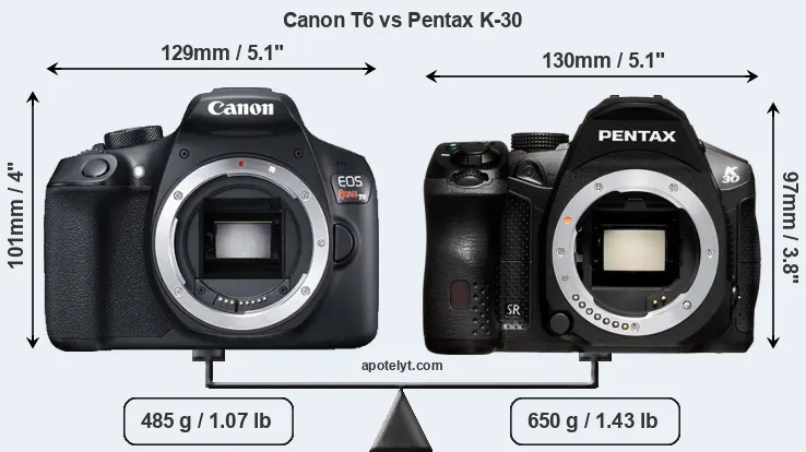 The physical size and weight of the Canon T6 and the Pentax K-30 are illustrated in the side-by-side display below. The two cameras are presented according to their relative size. Three consecutive views from the front, the top, and the rear side are shown. All width, height and depth measures are rounded to the nearest millimeter.