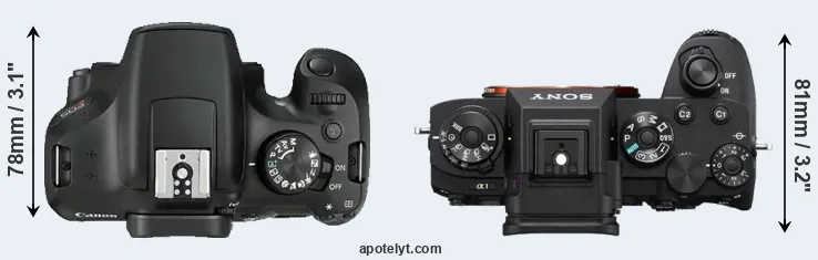 An illustration of the physical size and weight of the Canon T6 and the Sony A1 is provided in the side-by-side display below. The two cameras are presented according to their relative size. Three consecutive views from the front, the top, and the rear side are shown. All size dimensions are rounded to the nearest millimeter.