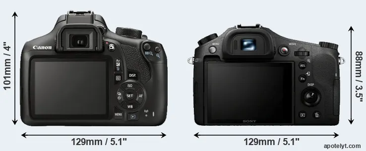 The side-by-side display below illustrates the physical size and weight of the Canon T6 and the Sony RX10. The two cameras are presented according to their relative size. Three consecutive views from the front, the top, and the rear side are shown. All width, height and depth dimensions are rounded to the nearest millimeter.