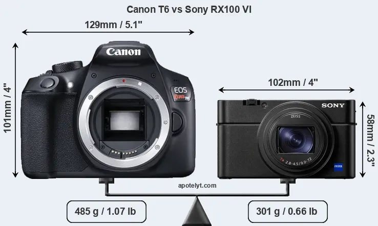 The side-by-side display below illustrates the physical size and weight of the Canon T6 and the Sony RX100 VI. The two cameras are presented according to their relative size. Three consecutive perspectives from the front, the top, and the back are available. All width, height and depth dimensions are rounded to the nearest millimeter.