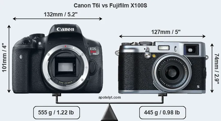 An illustration of the physical size and weight of the Canon T6i and the Fujifilm X100S is provided in the side-by-side display below. The two cameras are presented according to their relative size. Three consecutive perspectives from the front, the top, and the back are available. All size dimensions are rounded to the nearest millimeter.