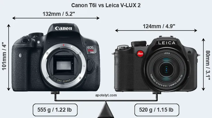 The physical size and weight of the Canon T6i and the Leica V-LUX 2 are illustrated in the side-by-side display below. The two cameras are presented according to their relative size. Three successive views from the front, the top, and the rear are shown. All width, height and depth measures are rounded to the nearest millimeter.