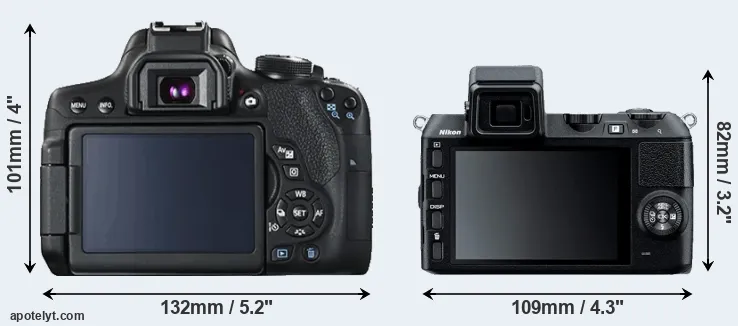 The side-by-side display below illustrates the physical size and weight of the Canon T6i and the Nikon 1 V2. The two cameras are presented according to their relative size. Three successive views from the front, the top, and the rear are shown. All width, height and depth measures are rounded to the nearest millimeter.