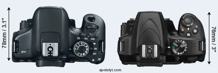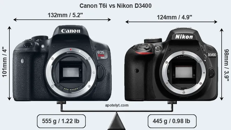 The side-by-side display below illustrates the physical size and weight of the Canon T6i and the Nikon D3400. The two cameras are presented according to their relative size. Three consecutive views from the front, the top, and the rear side are shown. All width, height and depth measures are rounded to the nearest millimeter.
